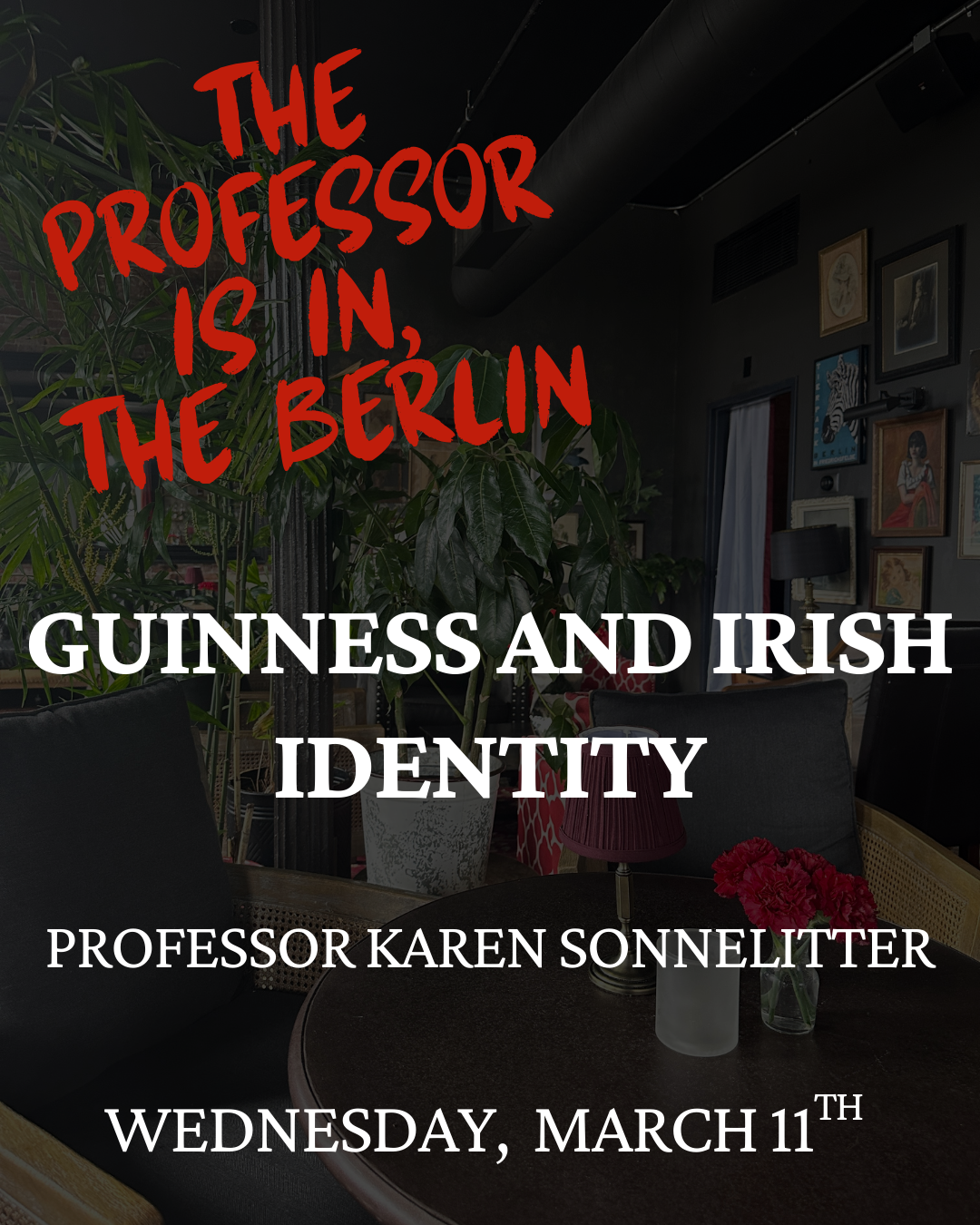 📚 The Professor is in The Berlin Join us on March 11th for the next installment of our lecture series featuring Professor Karen Sonnelitter and her talk: Guinness and Irish Identity ☘️ 🍻Dive into the rich history of Irish brewing and distilling, and explore how Guinness became the archetypal Irish beer. It’s the perfect way to celebrate the season with a drink in hand and something new to learn. Tickets available on our website - reserve your seat in advance!